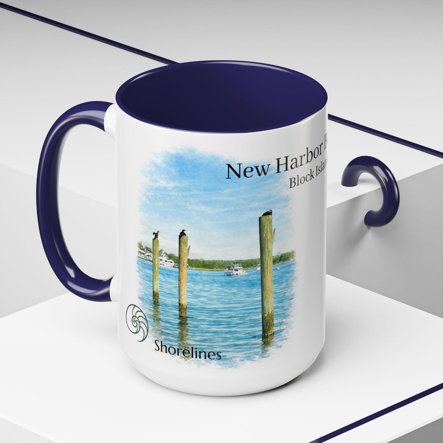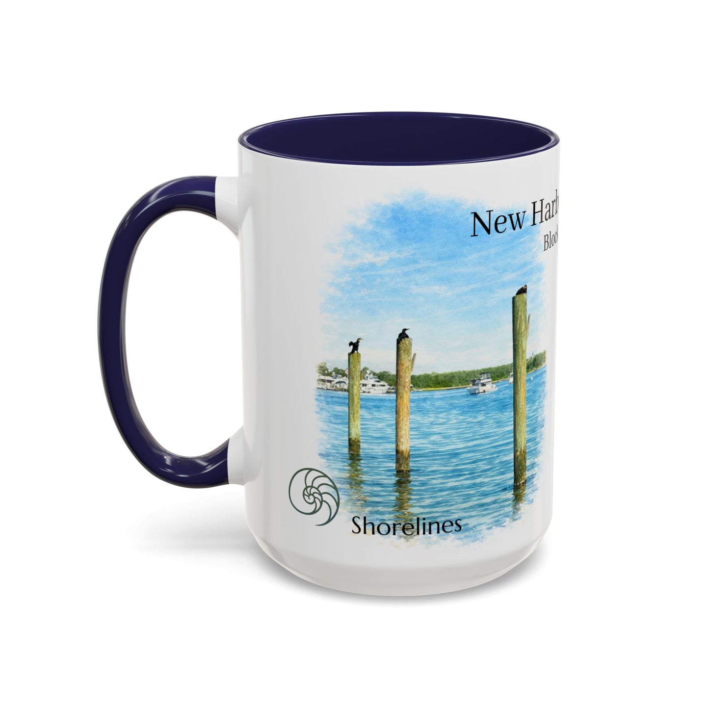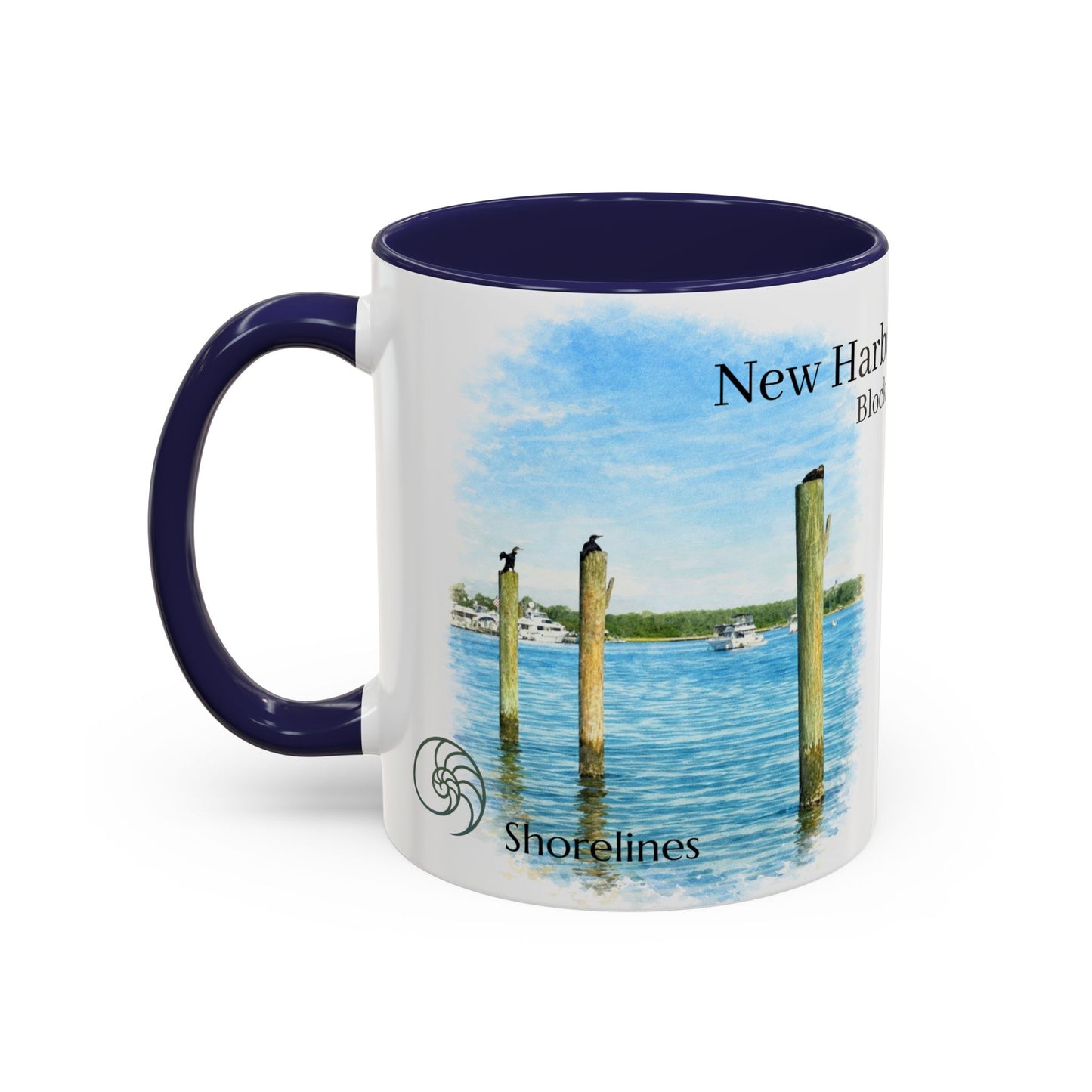 This ceramic accent mug brings quiet strength to every sip. Dedicated to New Harbor Boat Basin Block Island, RI .