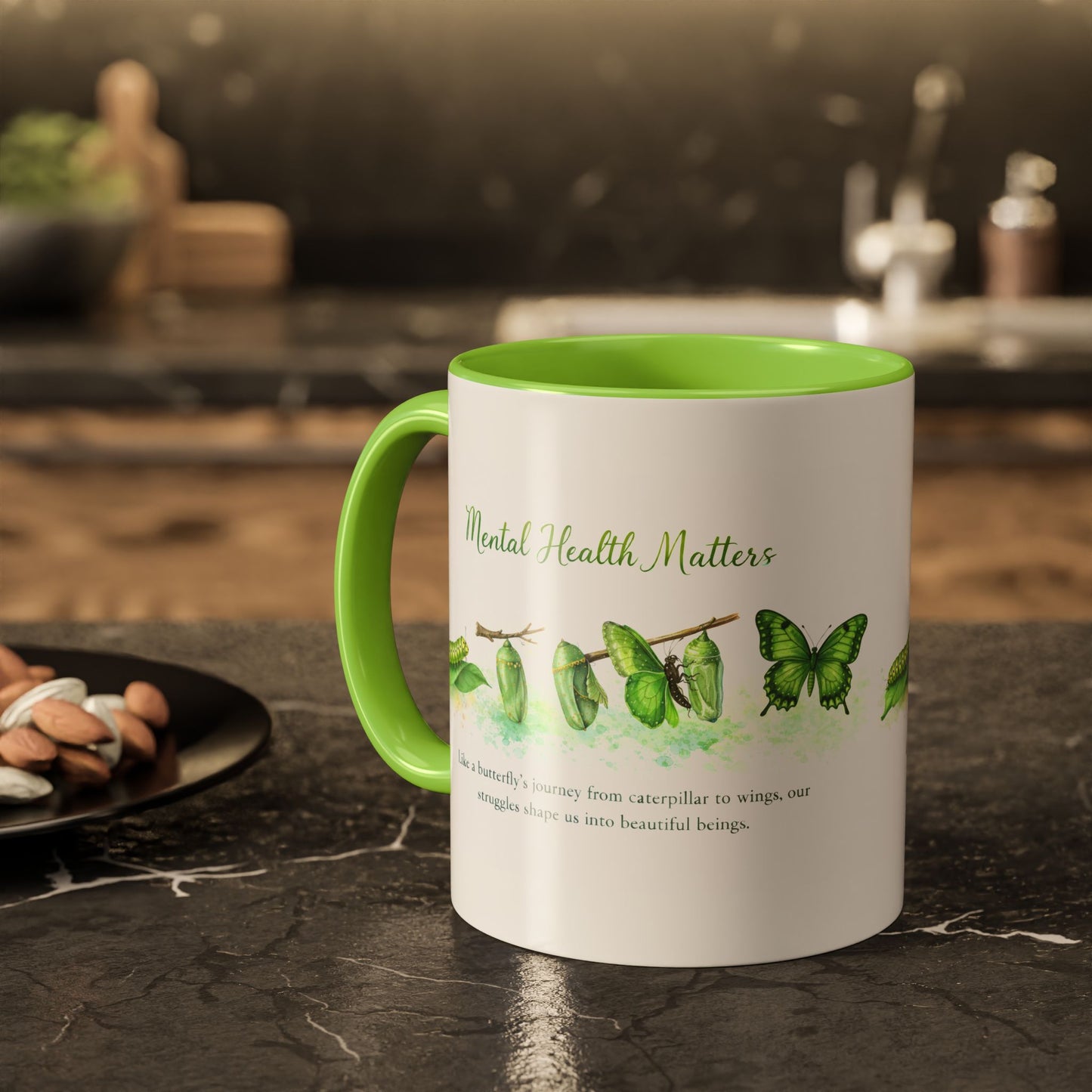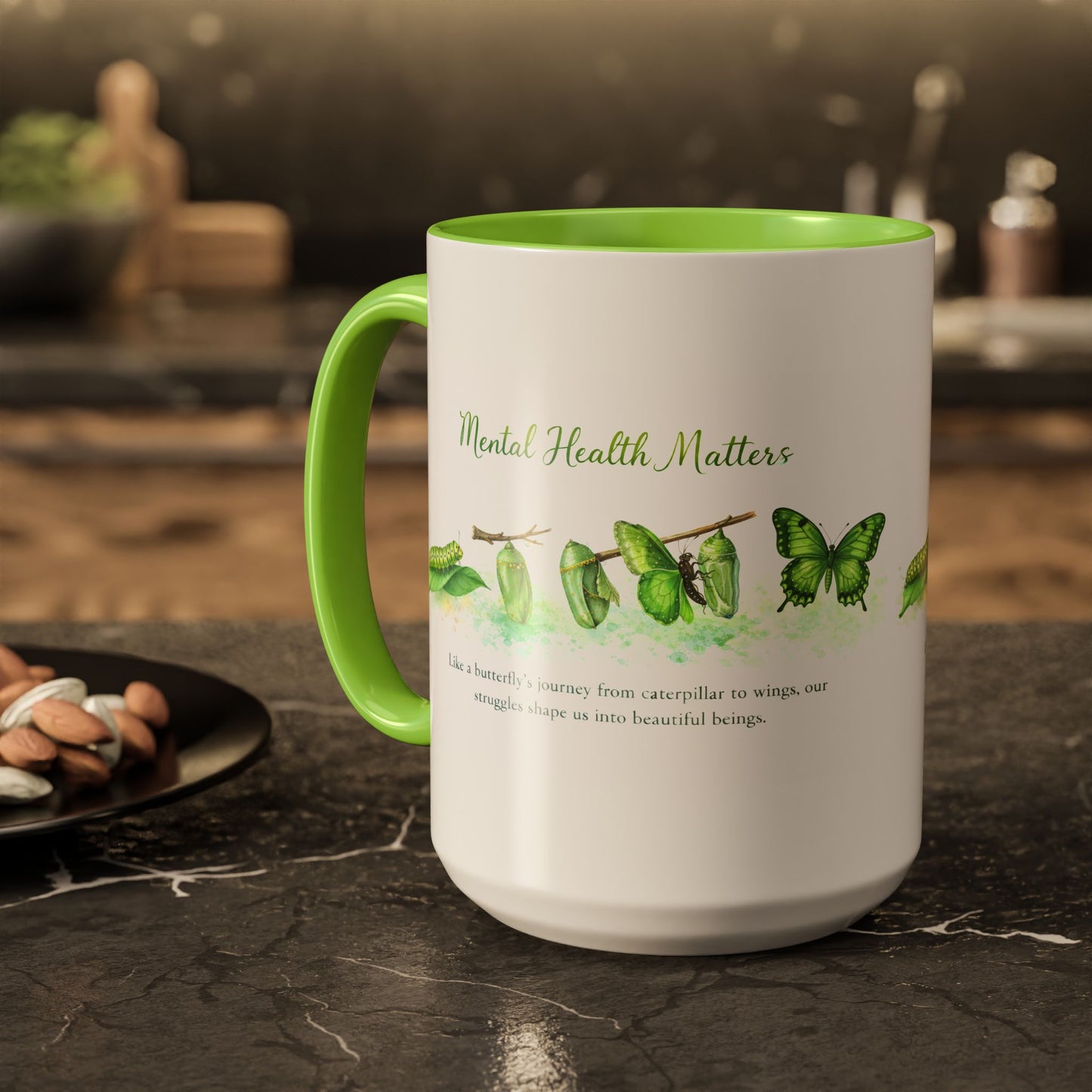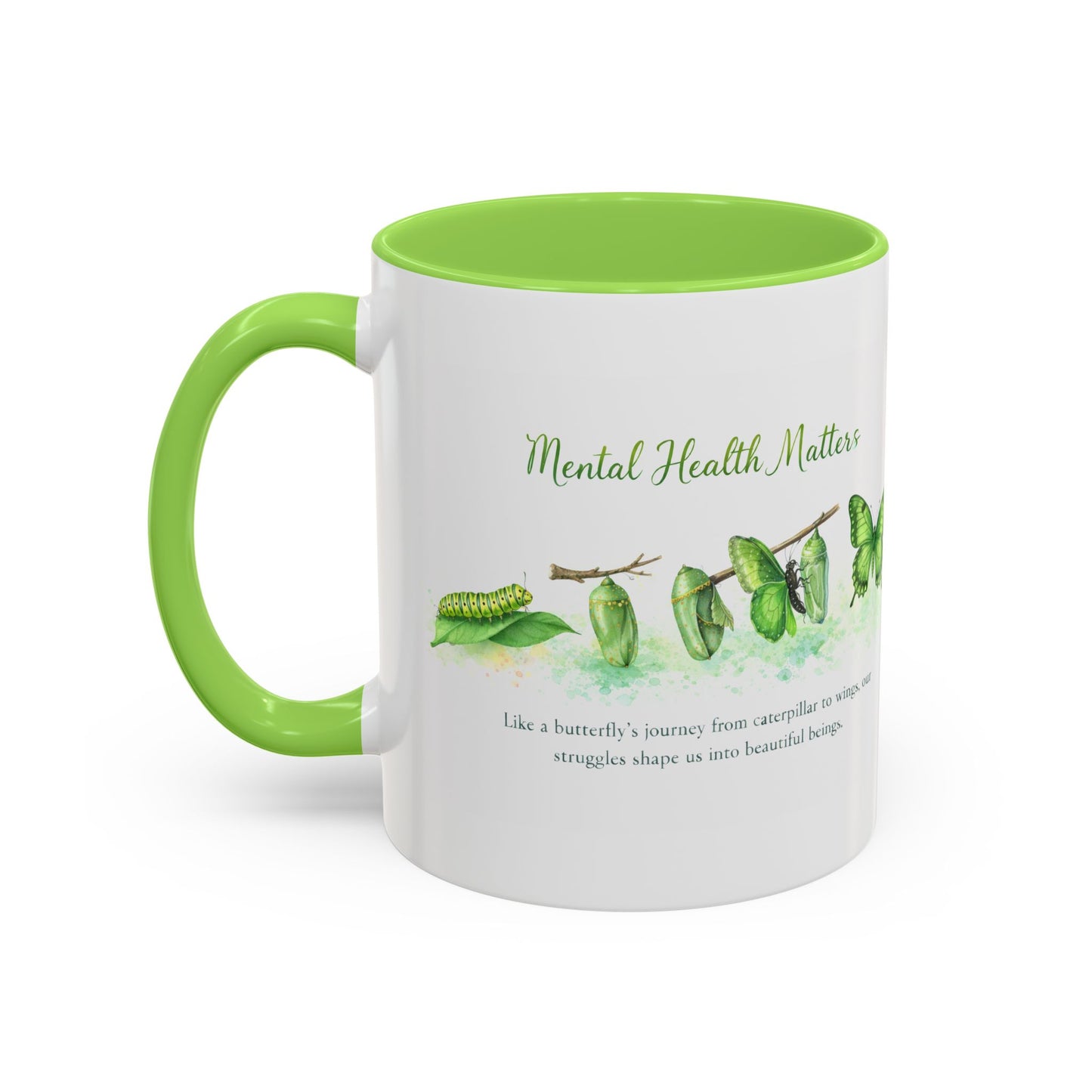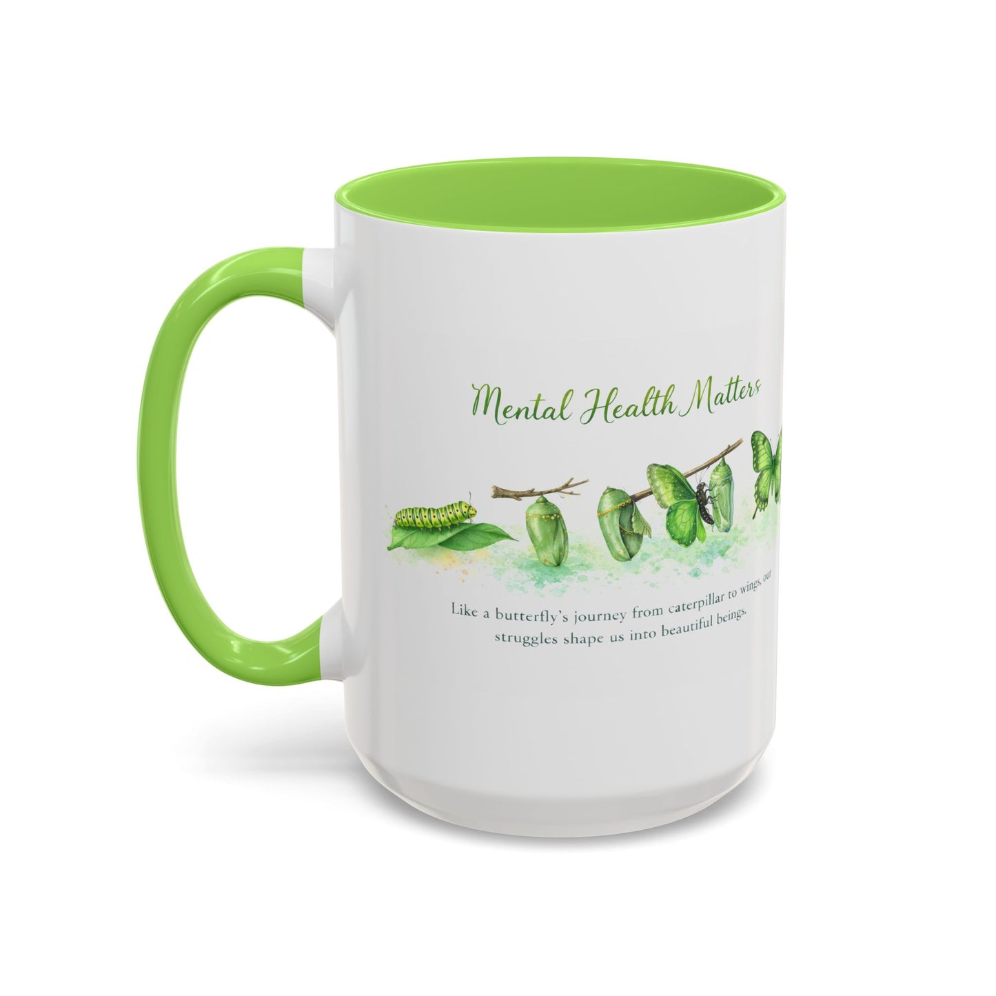 This ceramic accent mug brings quiet strength to every sip. Our Caterpillar to Wings Featuring a Beautiful design for Mental Health Awareness a visual reminder of resilience and awareness.